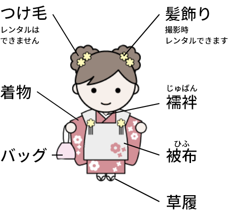 - つけ毛•髪飾り等、撮影時以外はレンタルできません。
